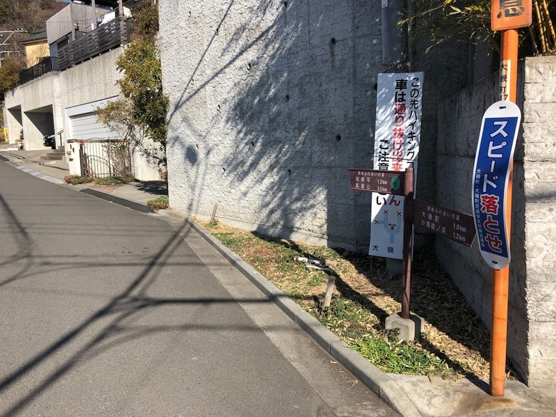 大磯駅から住宅街を抜け、徒歩で向かいます。「大磯」というと、恥ずかしながら大磯ロングビーチくらいしか存じ上げませんでしたが、素敵な家や低層マンションが並ぶ住宅街でした。山道開始まで2km程度です。