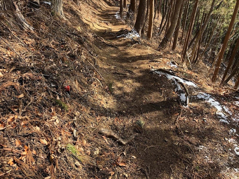 下りの登山道も、栃谷尾根コースと同じくらいの状況だと、転倒のおそれがあるためつらいなと思っていました。ですが、気温が高いのか、午後だったからなのか、通行量が多いためか、土とパウダースノーが混ざって、歩くのに支障なしです。